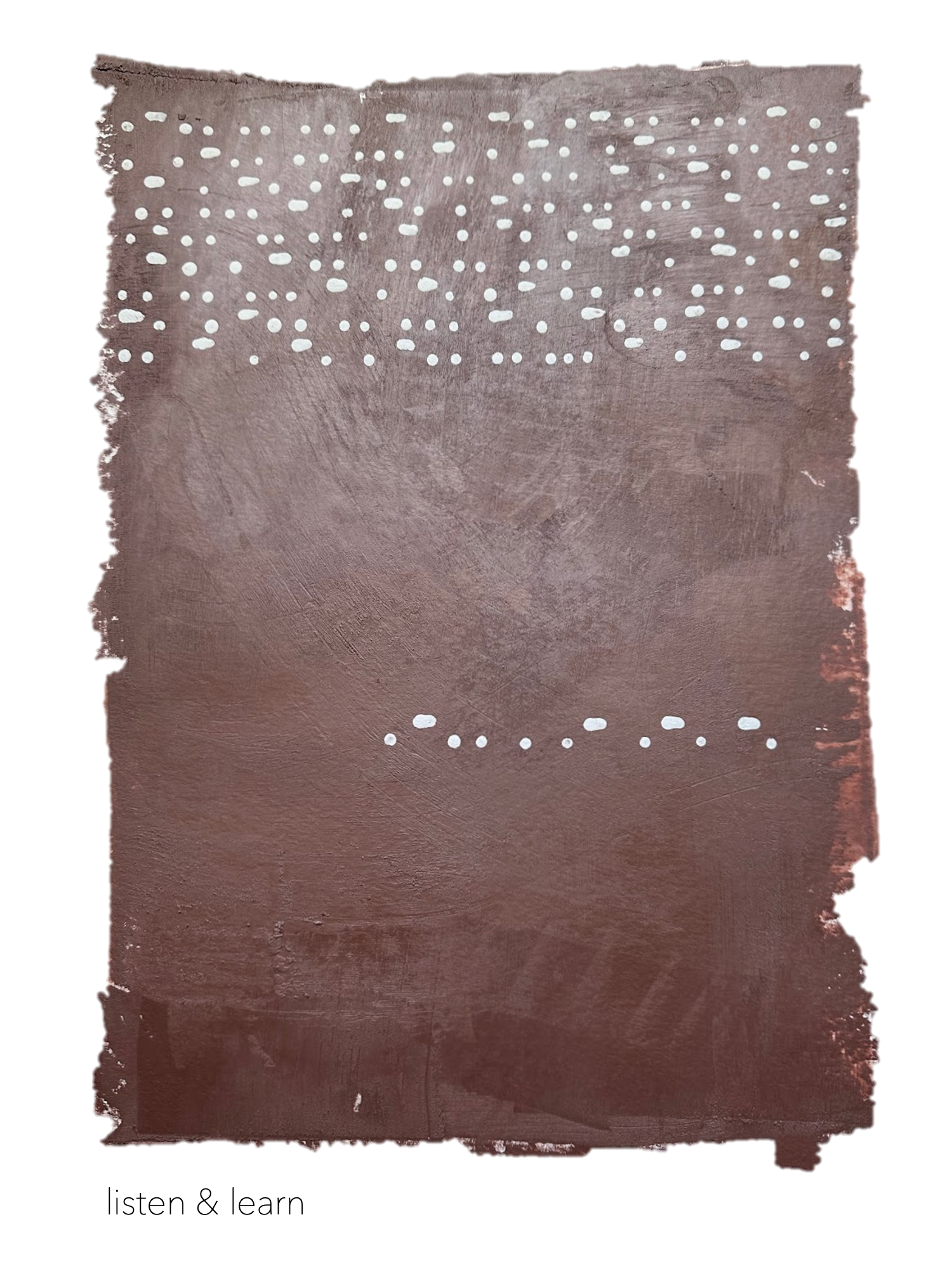 Sunrise ocher collected in Sunrise, Wyoming, USA which are Arapaho, Cheyenne, and Sioux Indigenous lands, past, present, and future. Listen is written many times while learn is written once in Morse code using natural, soil-based white watercolor paint.