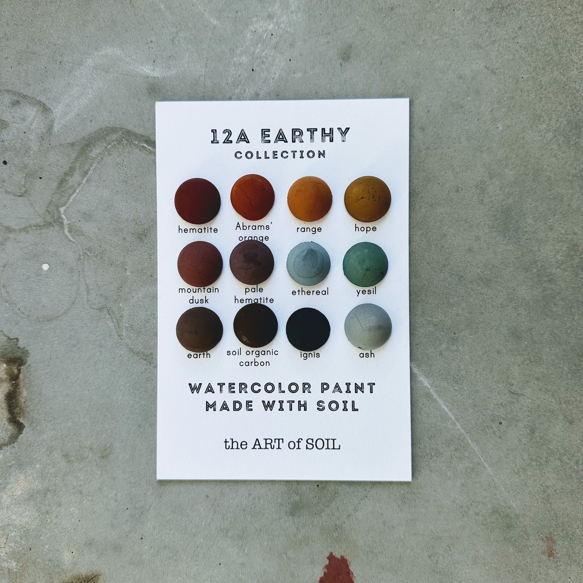 12A - earthy: hematite (64), Abrams’ orange (74), range (62), hope (93), mountain dusk (67), pale hematite (76), ethereal (83), yesil (77), earth (70), soil organic carbon (91), ignis (80), and ash (68).
