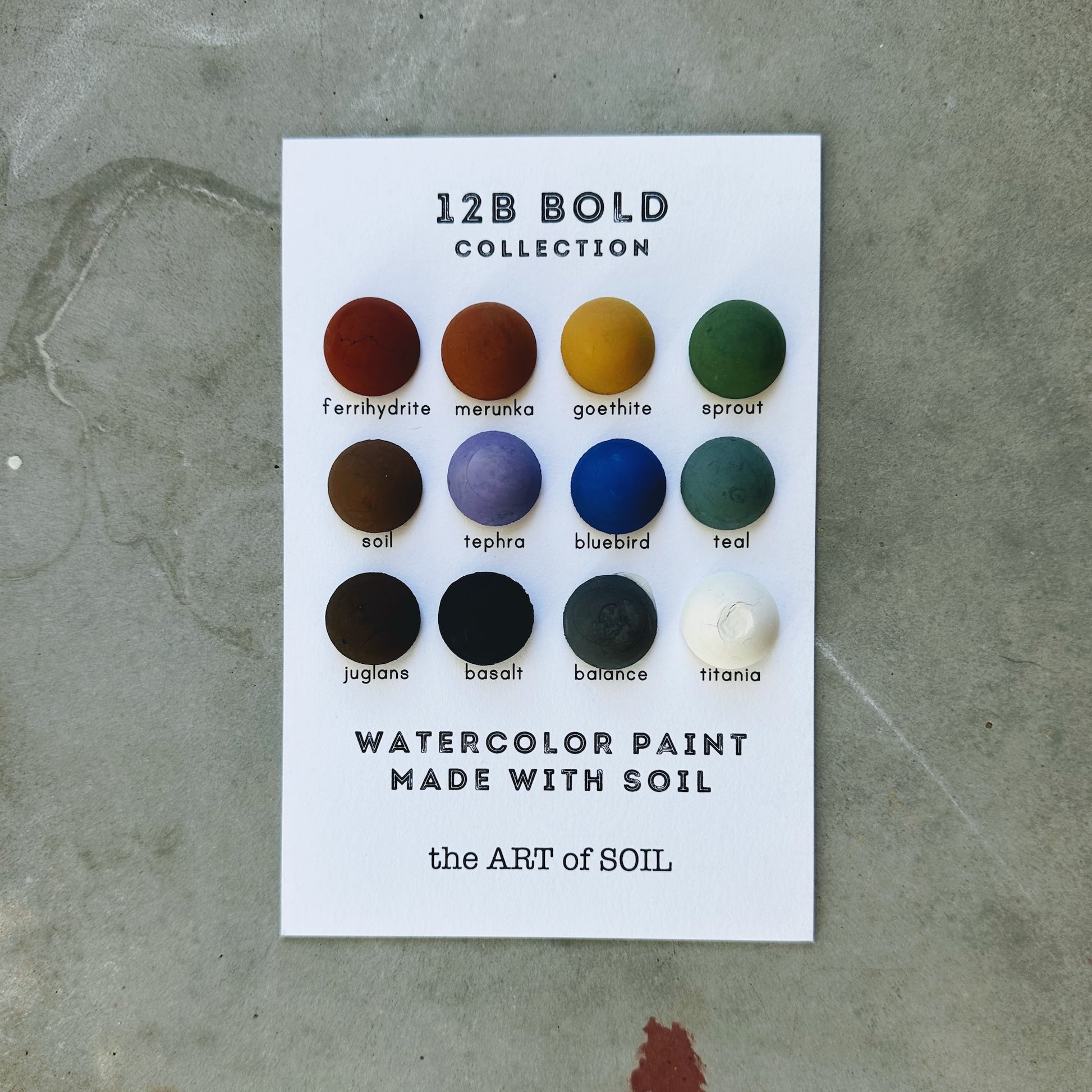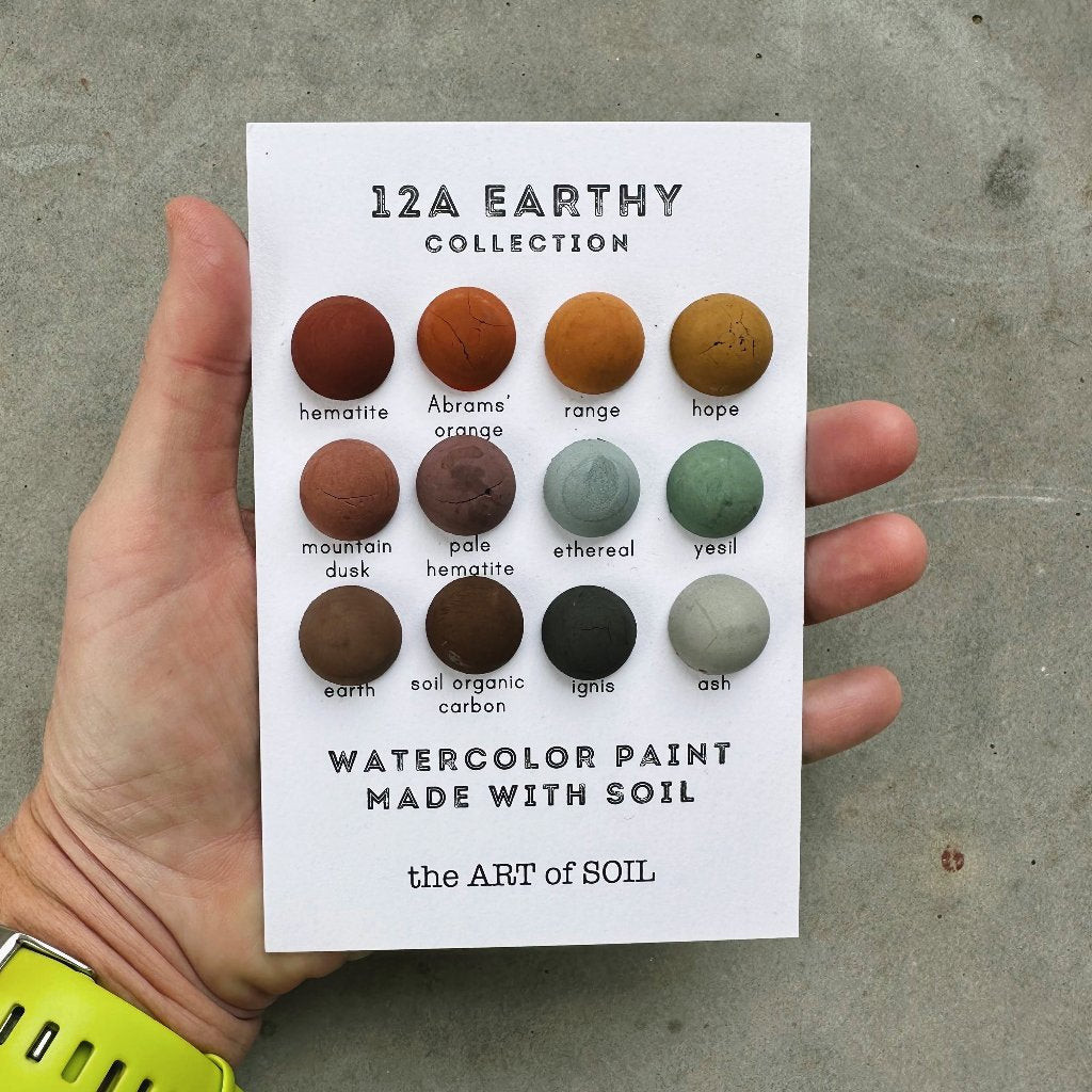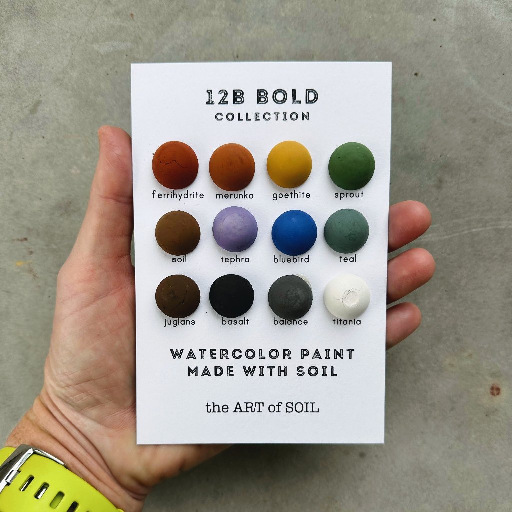 12 semi-spherical, pan-free, soil-based watercolor paint offered without a palette. Ecopods are ~1.5 ml of dry watercolor paint.