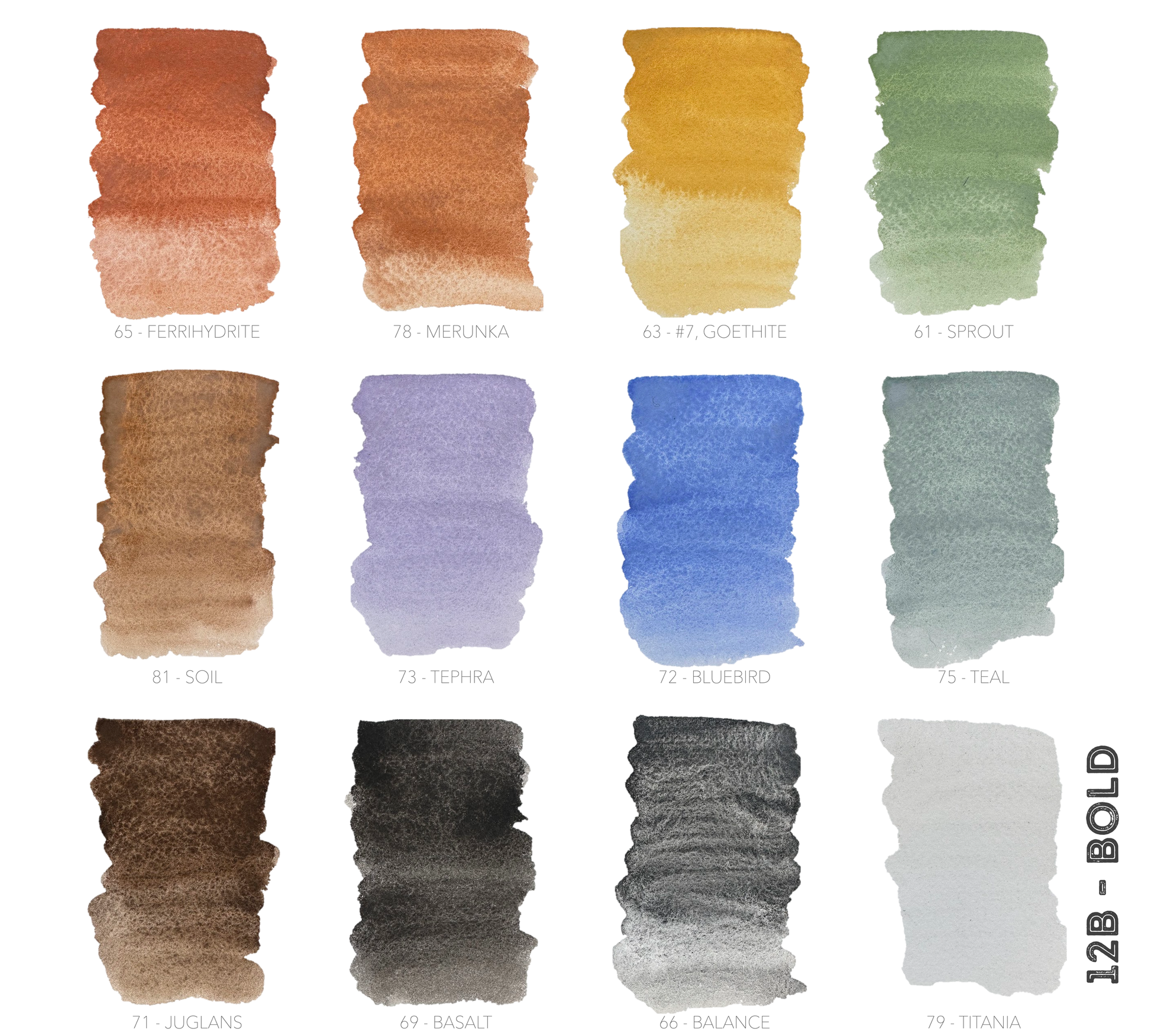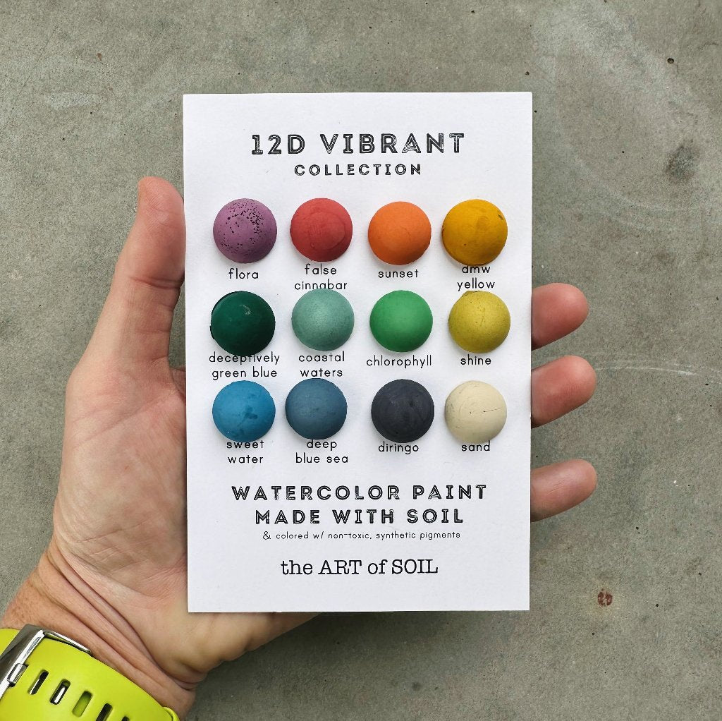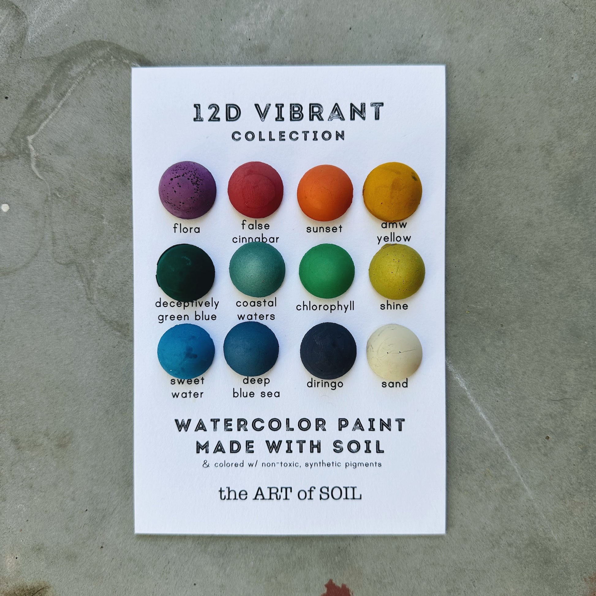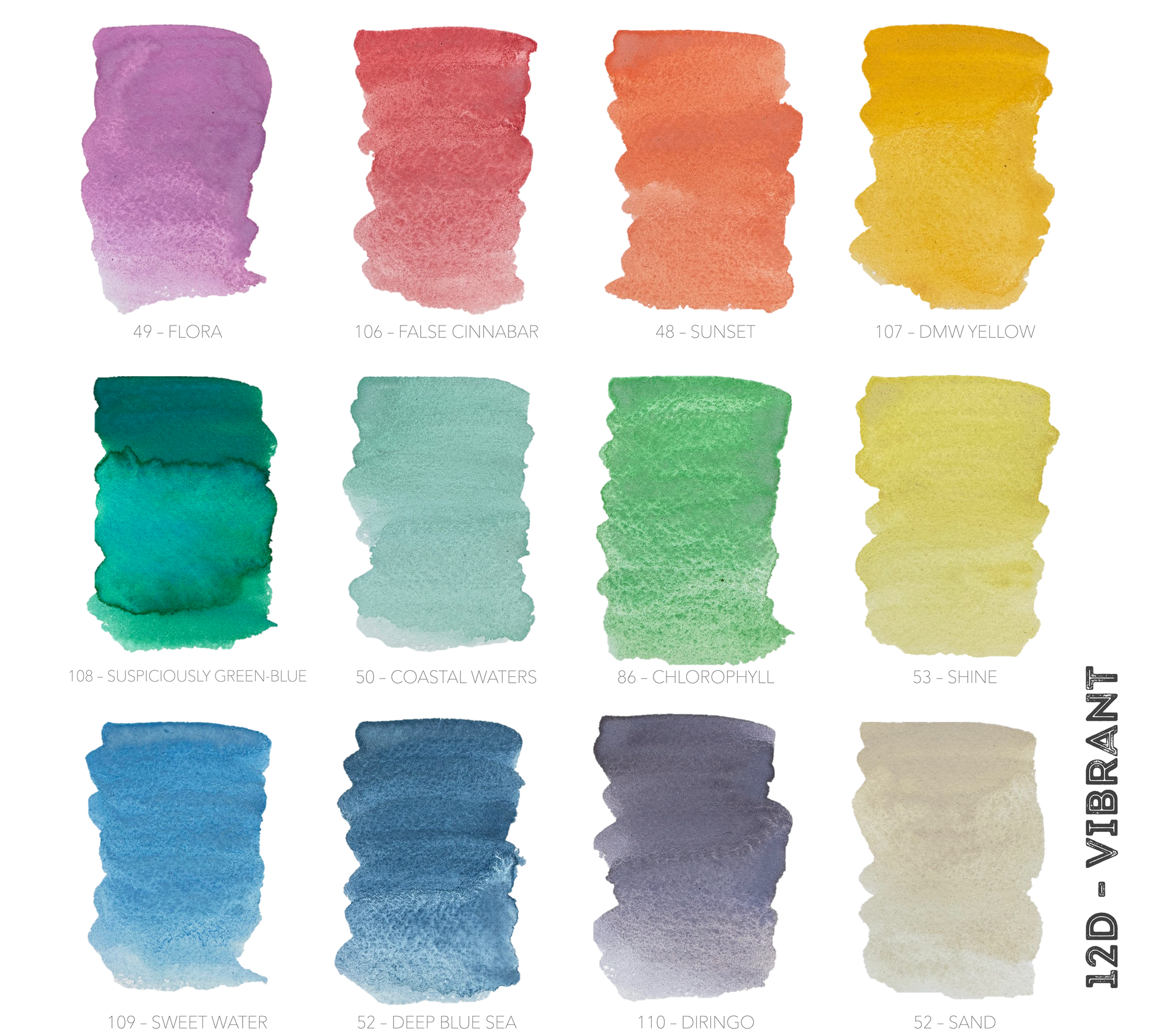 12D - vibrant: soil-based watercolors pigmented with non-toxic synthetic pigments: sundowner (49), false cinnabar (106), sunset (48), DMW yellow (107), shine (53), chlorophyll (86), deceptively blue green, sweet water, deep blue sea (52), diringo (110), and sand (85).