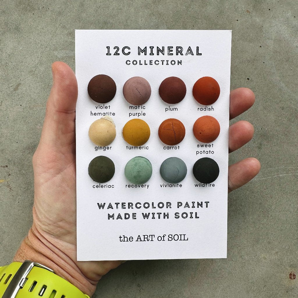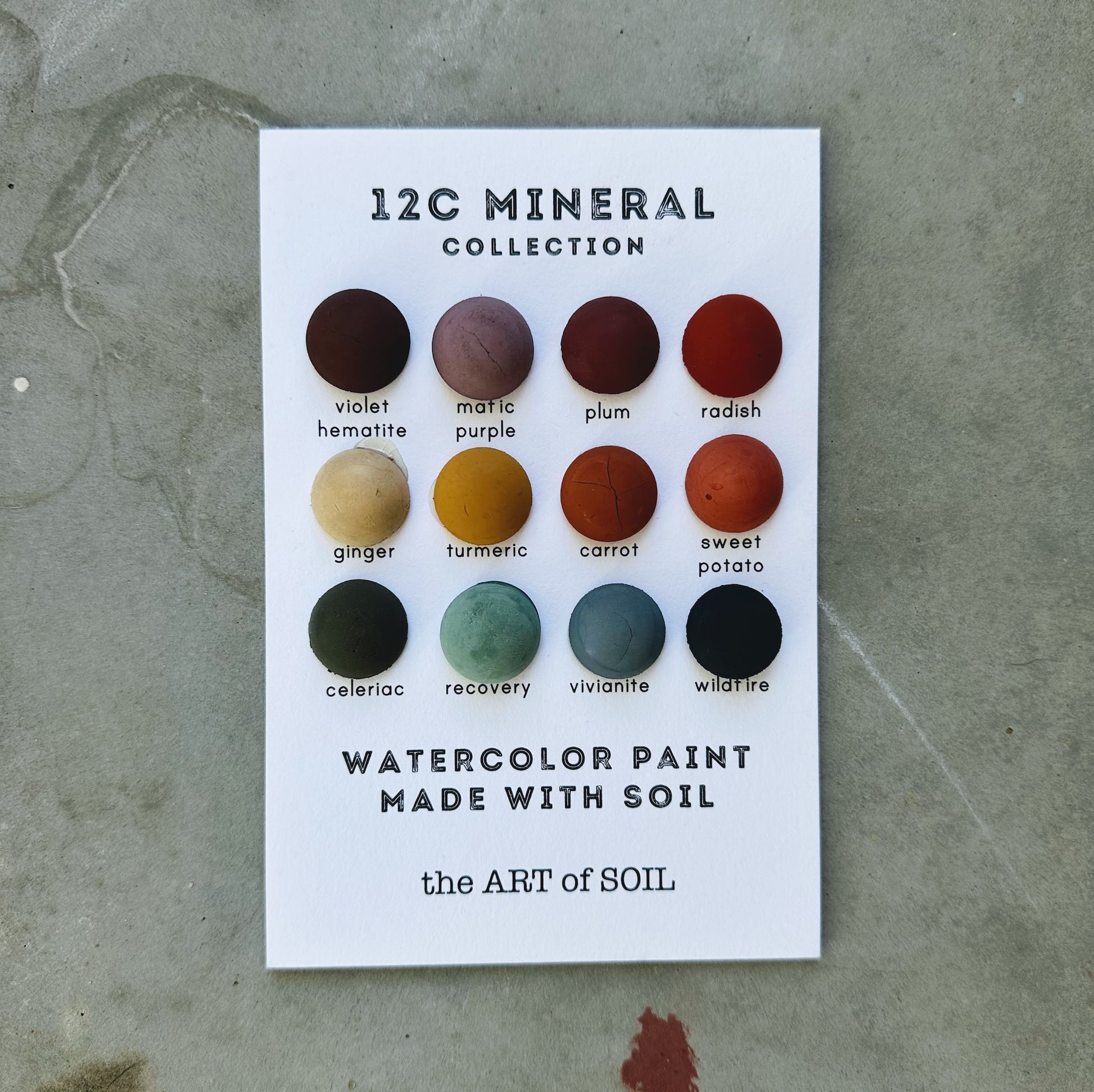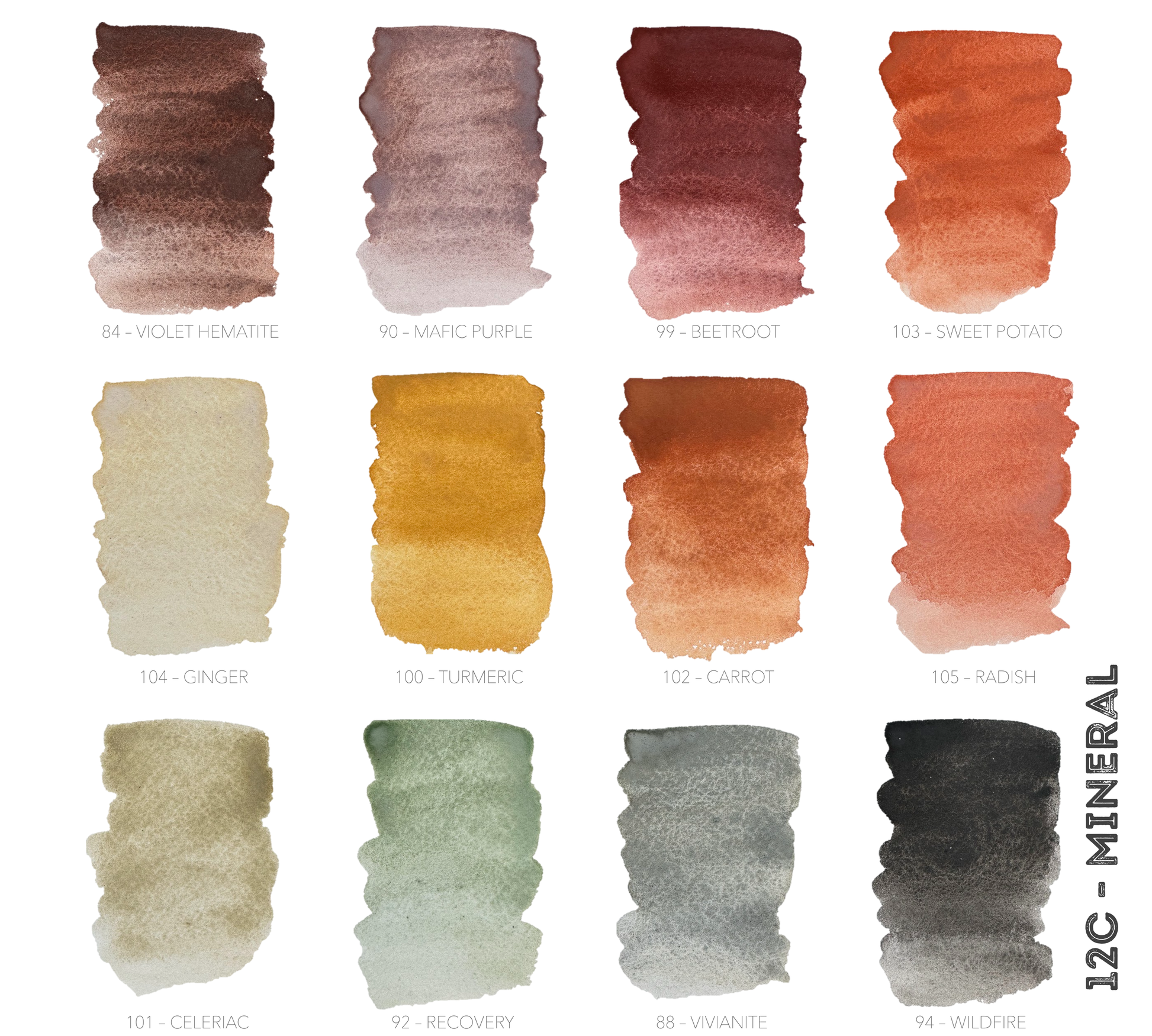 12C - mineral: all natural soil mineral-pigmented: deep ridge hematite (84), mafic purple (90), beetroot (99), sweet potato (105), radish (103), carrot (102), turmeric (100), ginger (104), celeriac (101), recovery (92), vivianite (88), and wildfire (94).