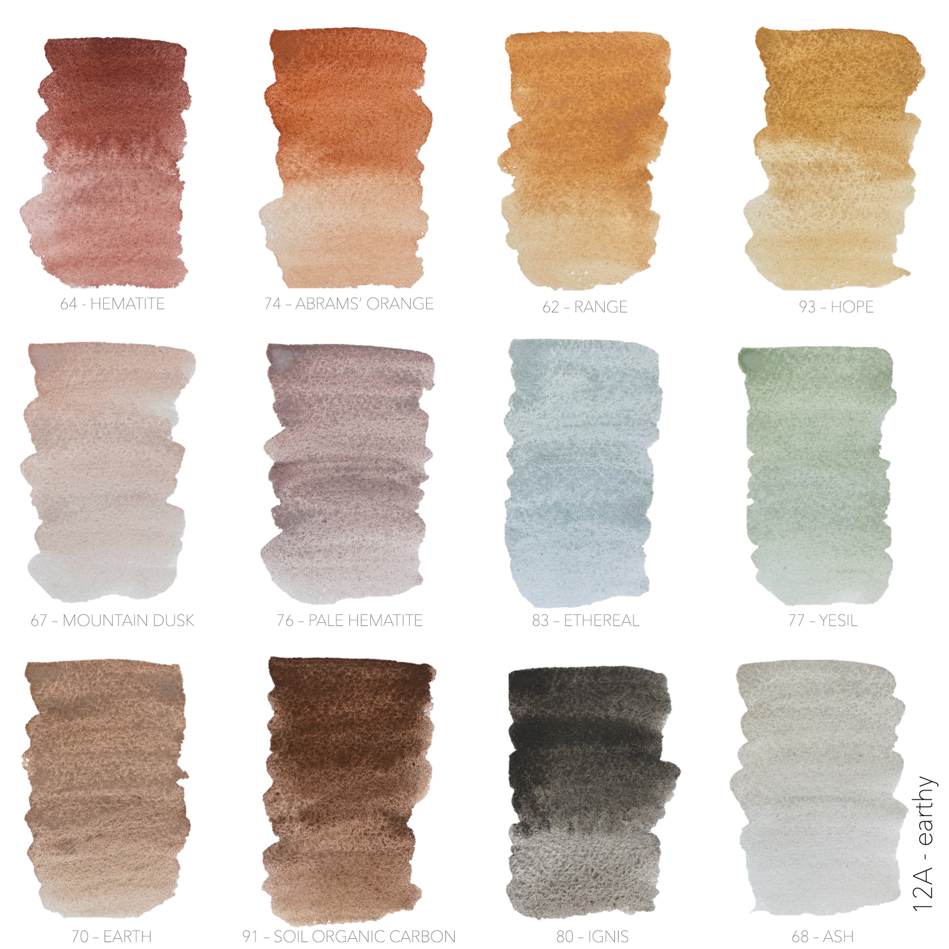 12A - earthy: hematite (64), Abrams’ clay (74), range (62), Red Desert green (29), mountain dusk (67), pale hematite (76), ethereal (83), yesil (77), earth (70), mollic brown (5), ignis (80), and ash (68).