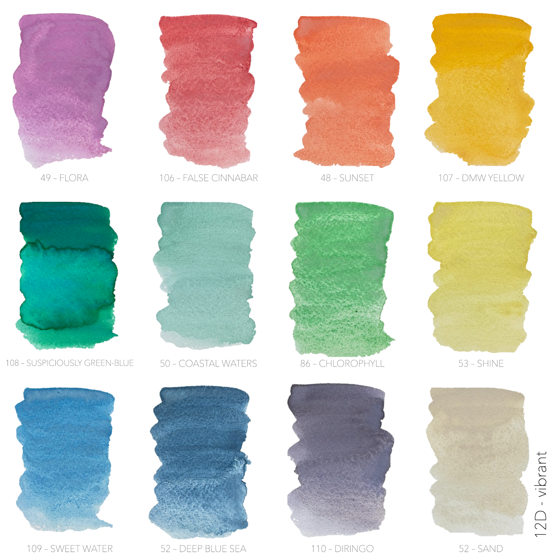 12D - vibrant: soil-based watercolors pigmented with non-toxic, synthetic pigments - sundowner (49), false cinnabar (106), sunset (48), DMW yellow (107), deceptively blue green (108), coastal waters (50), chlorophyll (86), shine (53), sweet water (109), deep blue sea (52), diringo (110), and sand (85).