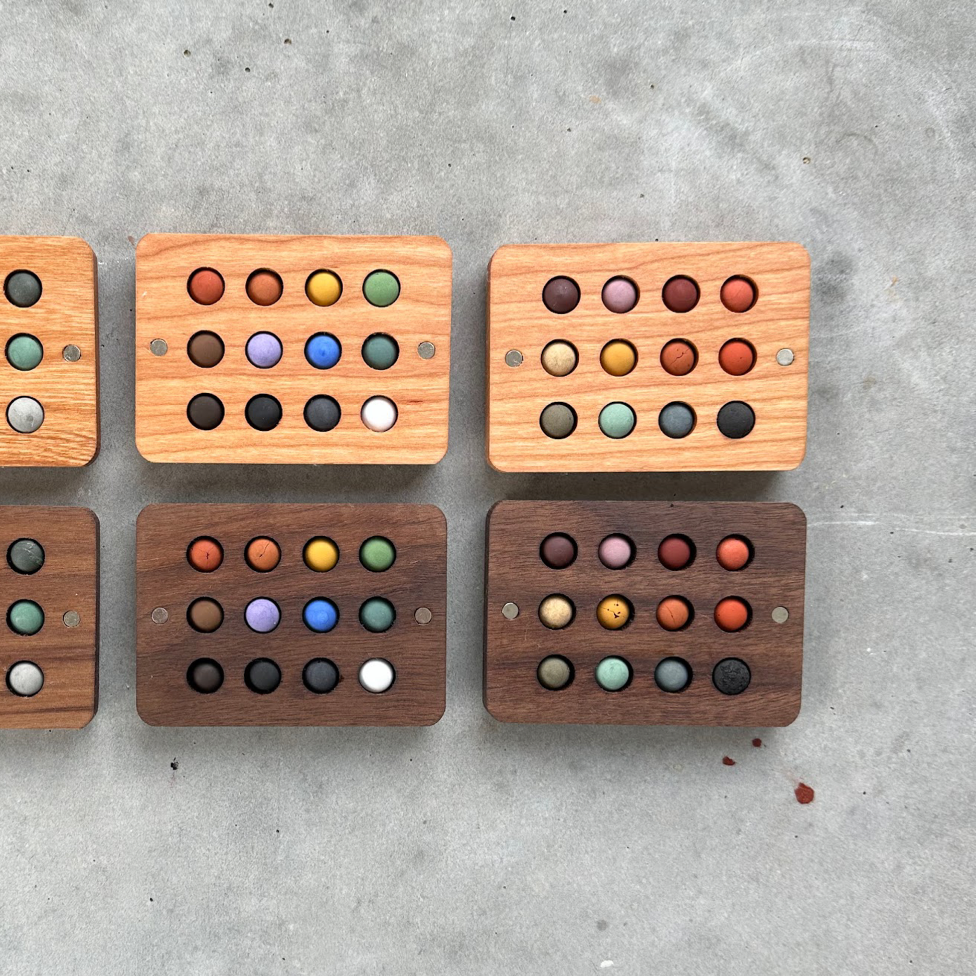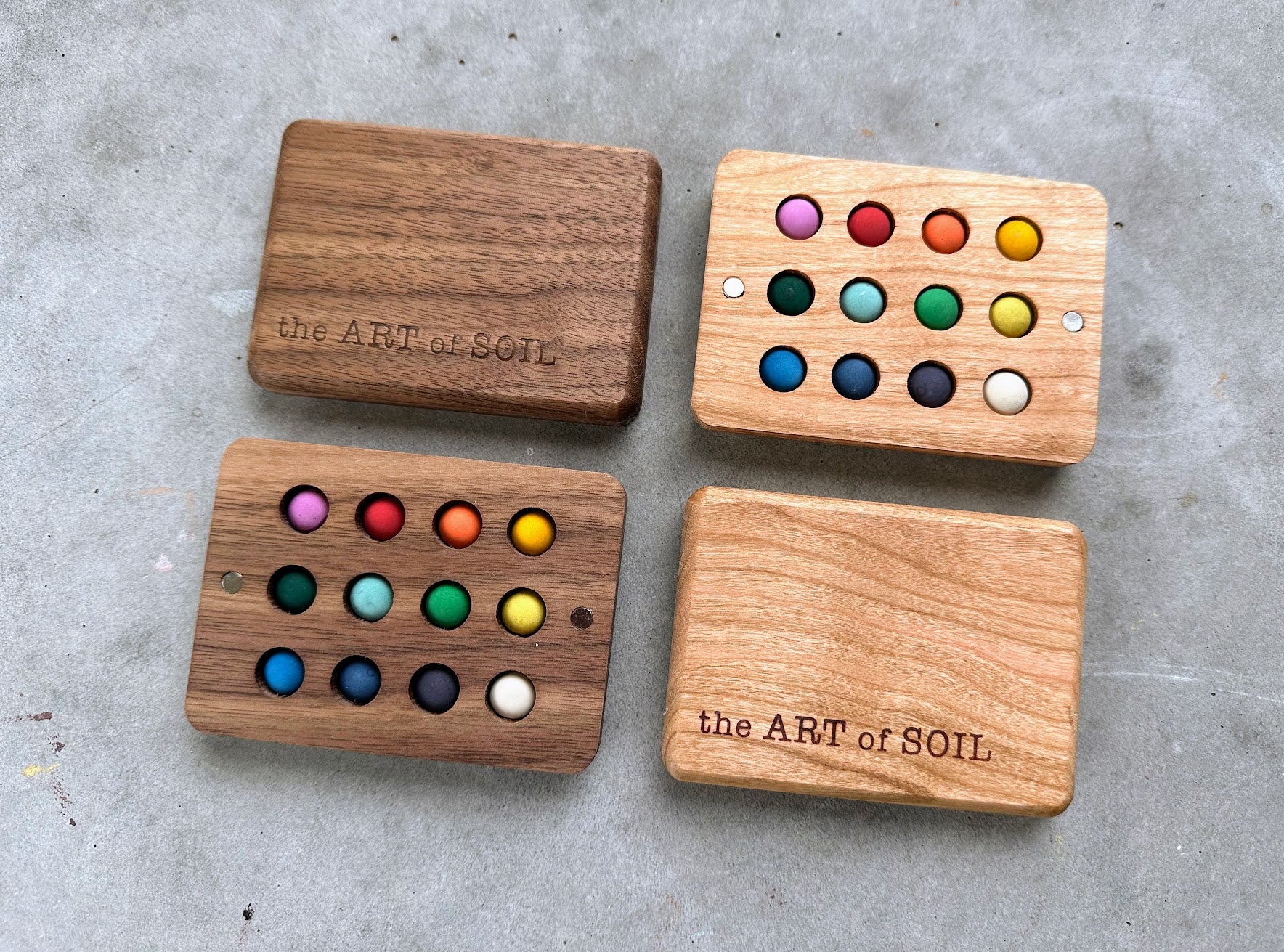 Twelve soil-based watercolor mini ecopods set in cherry (lighter) and walnut (darker) wooden palettes. Mini ecopods are approximately 0.5 ml of dry semi-spherical soil-based watercolor paint. They are set in a wooden palette sealed with tung oil with a mixing space on the underside of the lid. The base and lid can be closed and held together with 2 magnets. Palette dimensions are approximately 3.5” x 2.5” x 1”. Refills for this palette are available.