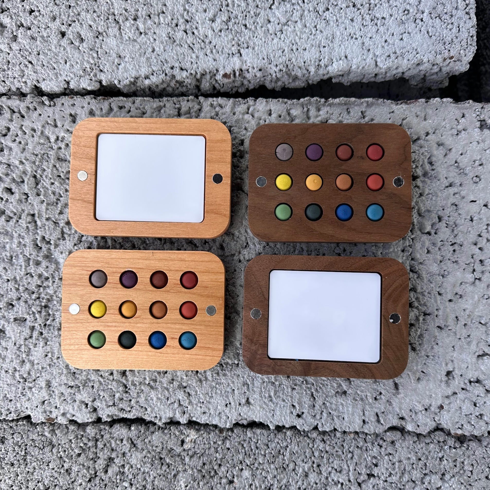 Twelve soil-based watercolor mini ecopods set in cherry (lighter) and walnut (darker) wooden palettes. Mini ecopods are approximately 0.5 ml of dry semi-spherical soil-based watercolor paint. They are set in a wooden palette with a mixing space on the underside of the lid. The base and lid can be closed and held together with 2 magnets. Palette dimensions are approximately 3.5” x 2.5” x 1”. Refills for this palette are available.