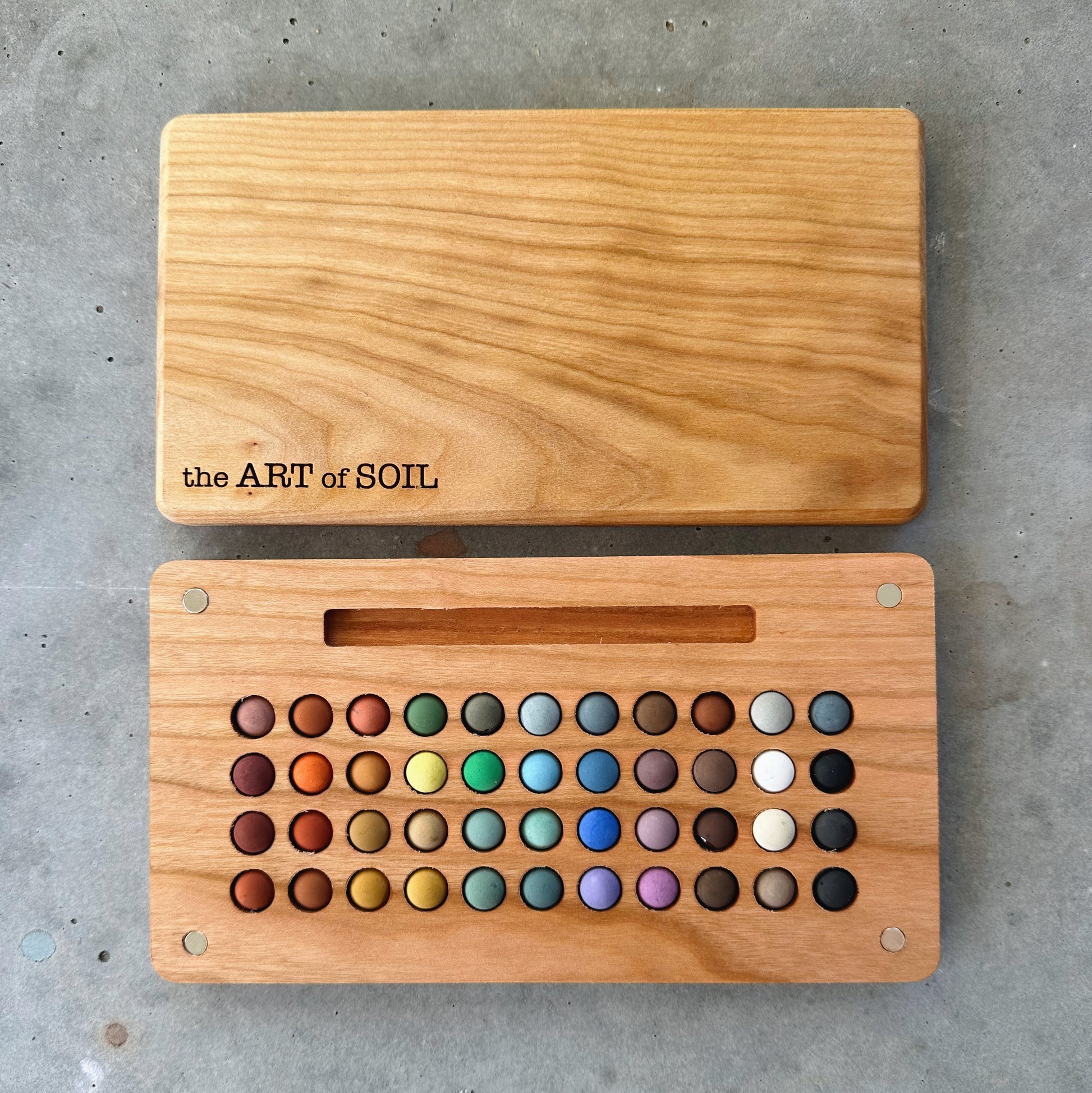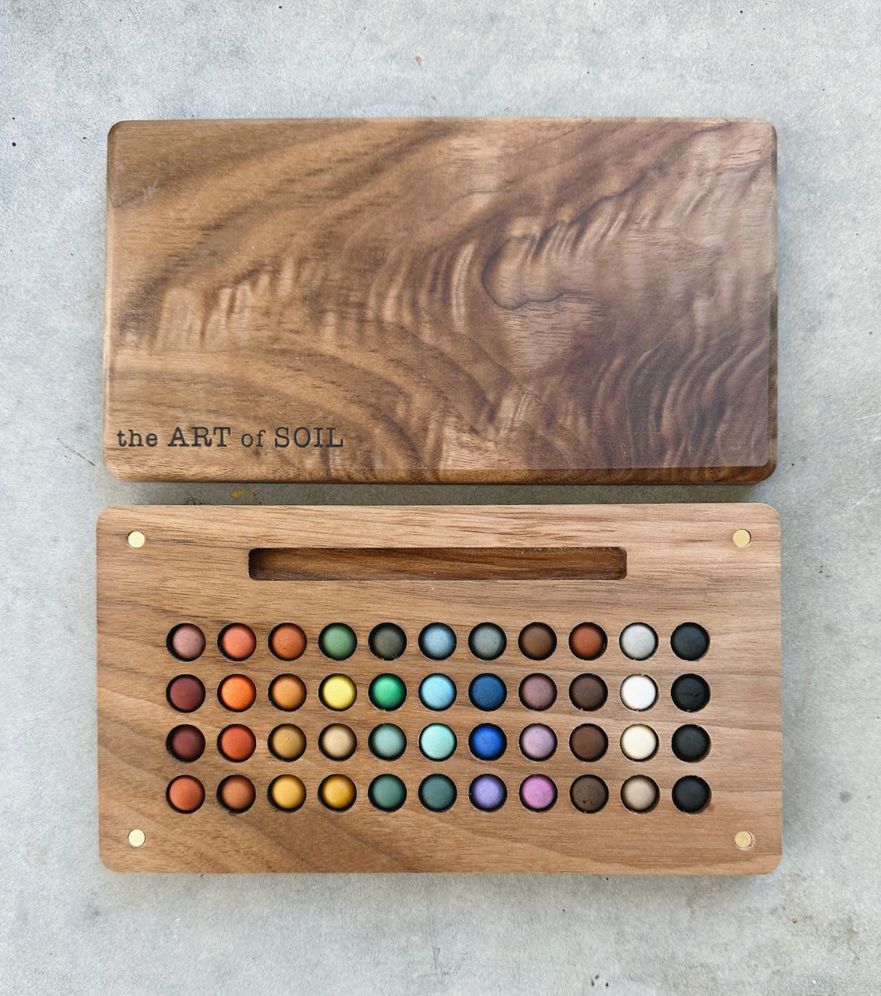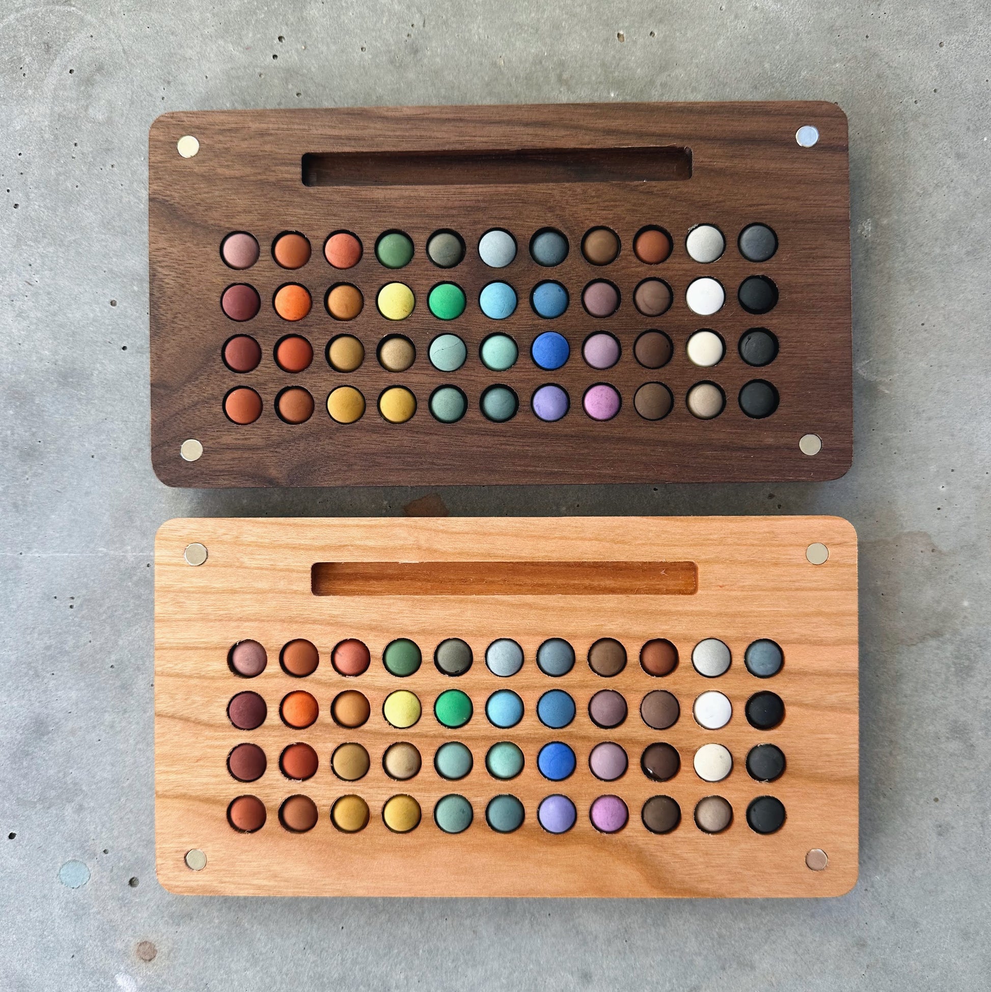 44 mini ecopods of soil-based watercolor set in cherry (lighter) and walnut (darker) wooden palettes. Mini ecopods are approximately 0.5 ml of dry semi-spherical soil-based watercolor paint. They are set in a wooden palette with a mixing space on the underside of the lid. The base and lid can be closed and held together with 4 magnets. Palette dimensions are approximately 4” x 7.5” x 1”. A travel watercolor brush (not included) fits in the horizontal well.