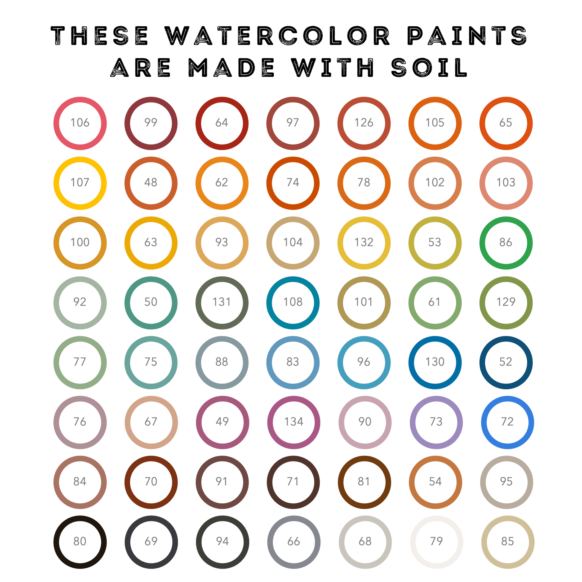 This is our most extensive palette to date: 56 mini ecopods of soil-based watercolor paint, set into a walnut wooden palette. Each mini ecopod is approximately 0.4 ml of dry, semi-spherical soil-based watercolor paint. The palette includes our new mixing spaces on the underside of the lid and measures approximately 6” × 6.4” × 1”.