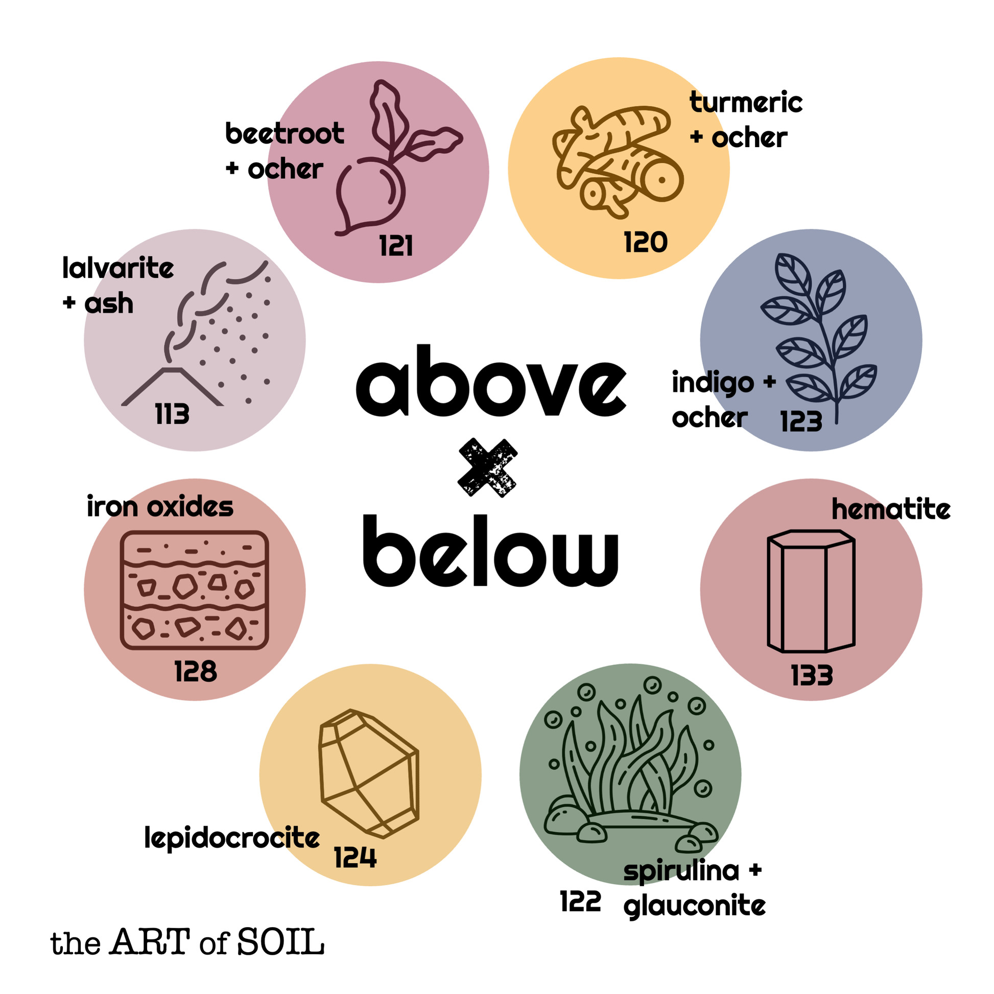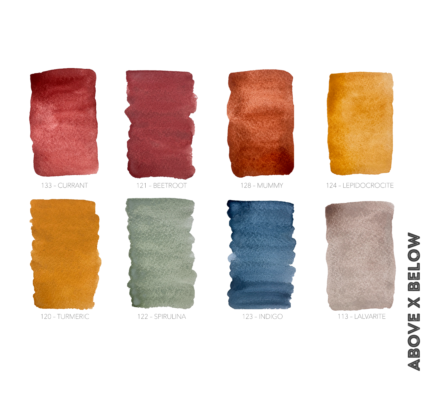 Soil-based watercolor paint pigmented with natural soil minerals, plants, and algae. "Above" colors are turmeric & ocher (120), spirulina & glauconite (122), indigo and ocher (123), beetroot & ocher (121) - while "below" colors are lalvarite & ash (113), assorted iron oxides (mummy, 128), lepidocrocite (124), and hematite (currant, 133).