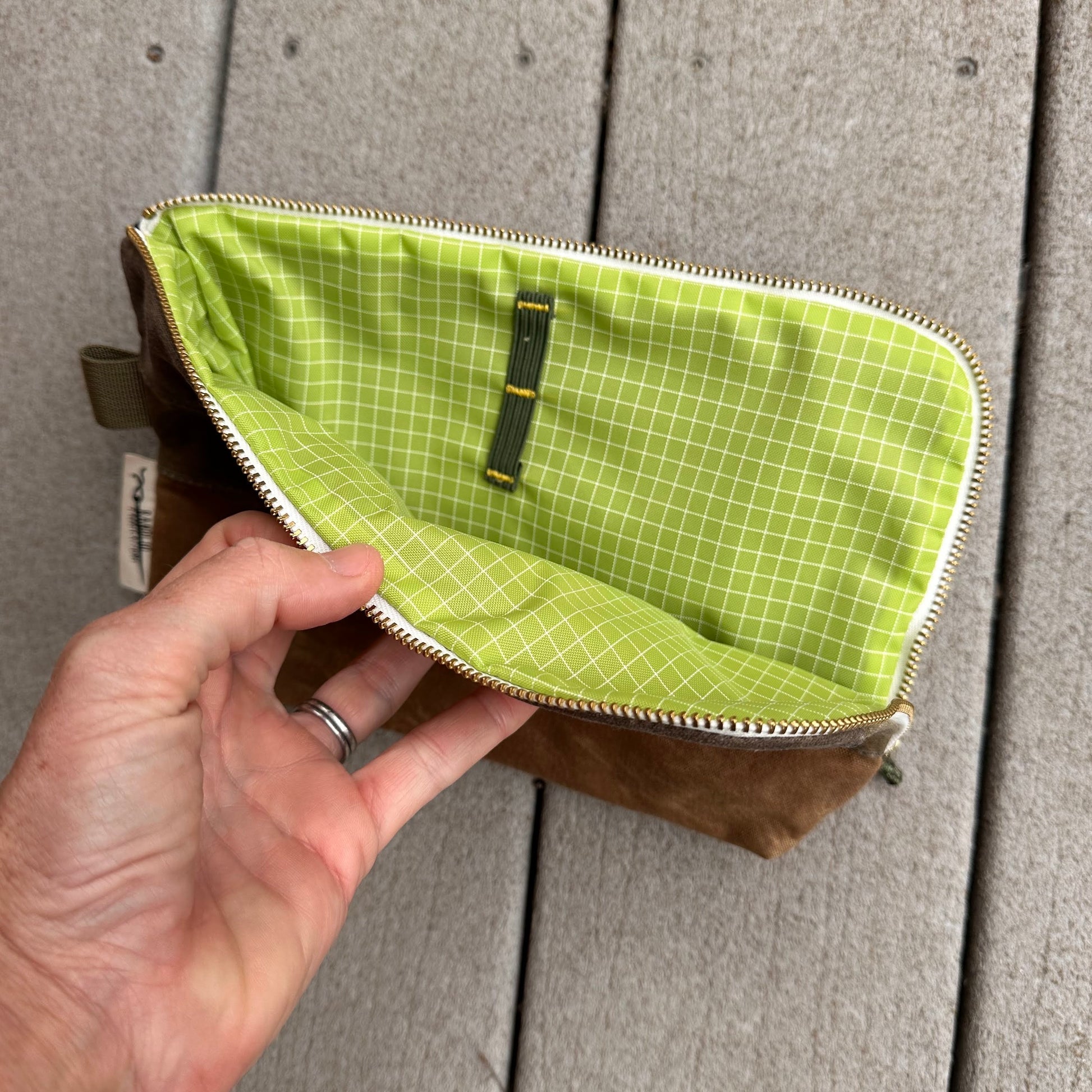 Handmade in Elkton, Oregon, home of the best soils for cool-climate Pinot Noir, this zippered pouch is constructed with 10.10 oz cotton waxed canvas in a layered design inspired by soil profiles. The durable YKK brass zipper extends down the side of the pouch for easy access to your watercolor supplies. The interior of the pouch is lined with chartreuse Dyneema ripstop that can be wiped down easily, and we've added elastic loops to keep your writing utensils in place. Attach a carabiner to the webbing loop on the side of the bag to clip it to your pack when you're on the go. Now get out there and get it dirty!