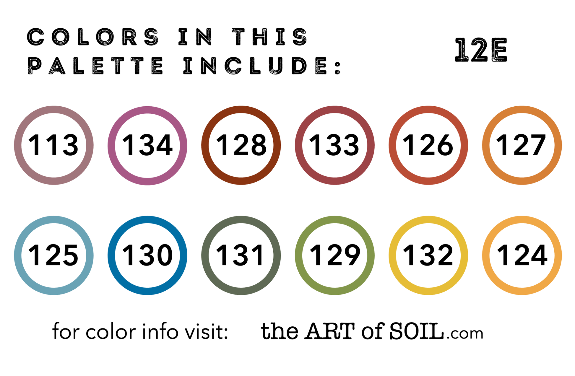 12E - expedition: lalvarite (113), not sea snail (134), mummy (128), currant (133), sol (132), lepidocrocite (124), burn stone (127), rossa (126), grass (129), spruce (131), electric (130), and nila (125).
