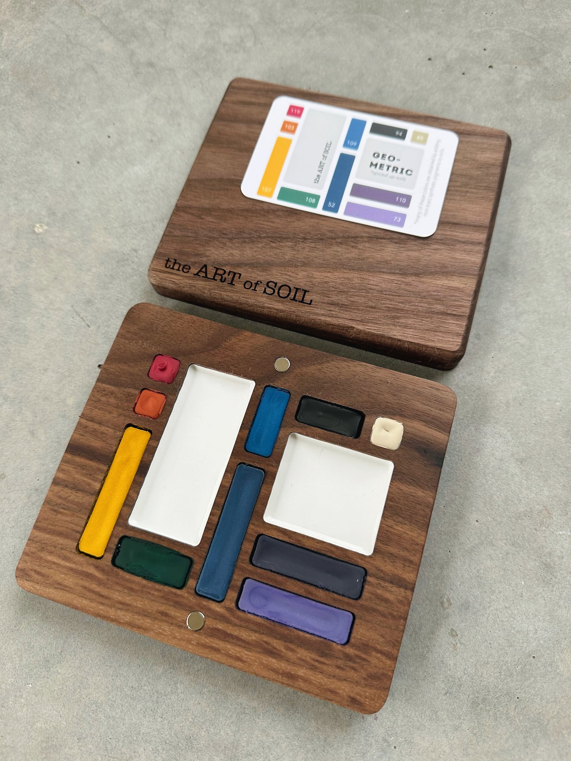 The Geometric palette is available in two color ways – enhanced colors in walnut wood that are bold and striking and all natural in cherry wood containing soil-mineral pigmented watercolors.