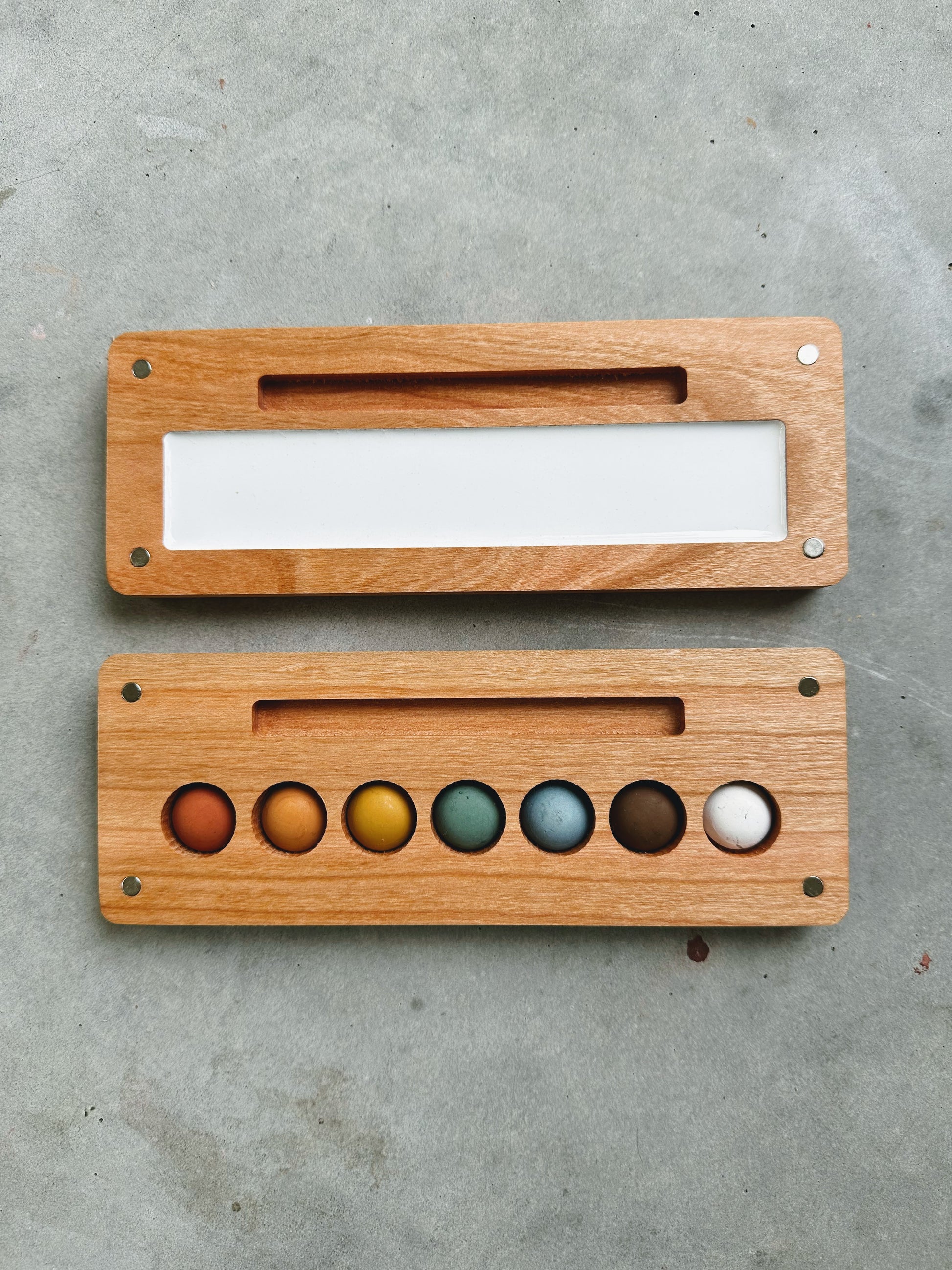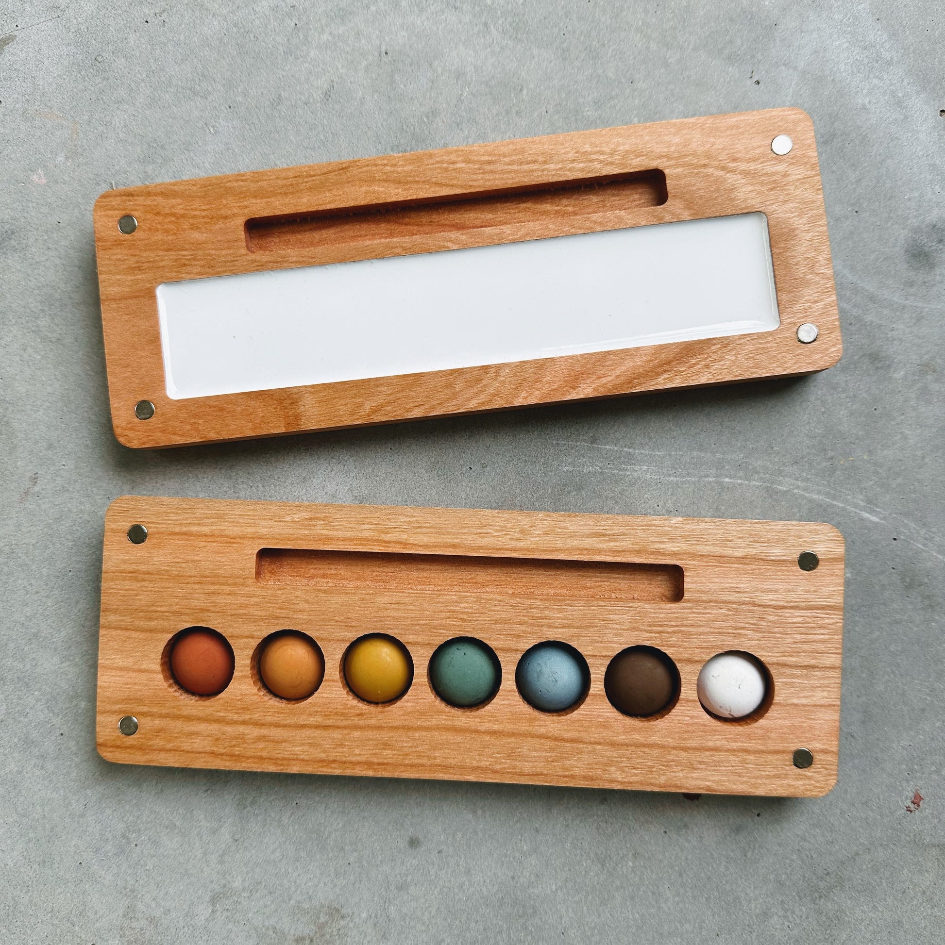 Ecopods are approximately 1.5 ml of dry semi-spherical soil-based watercolor paint. They are set in a wooden palette with a plant-based mixing space on the underside of the lid. The base and lid can be closed and held together with 4 magnets. A travel-sized watercolor brush (not included) fits into the horizontal well for easy storage.