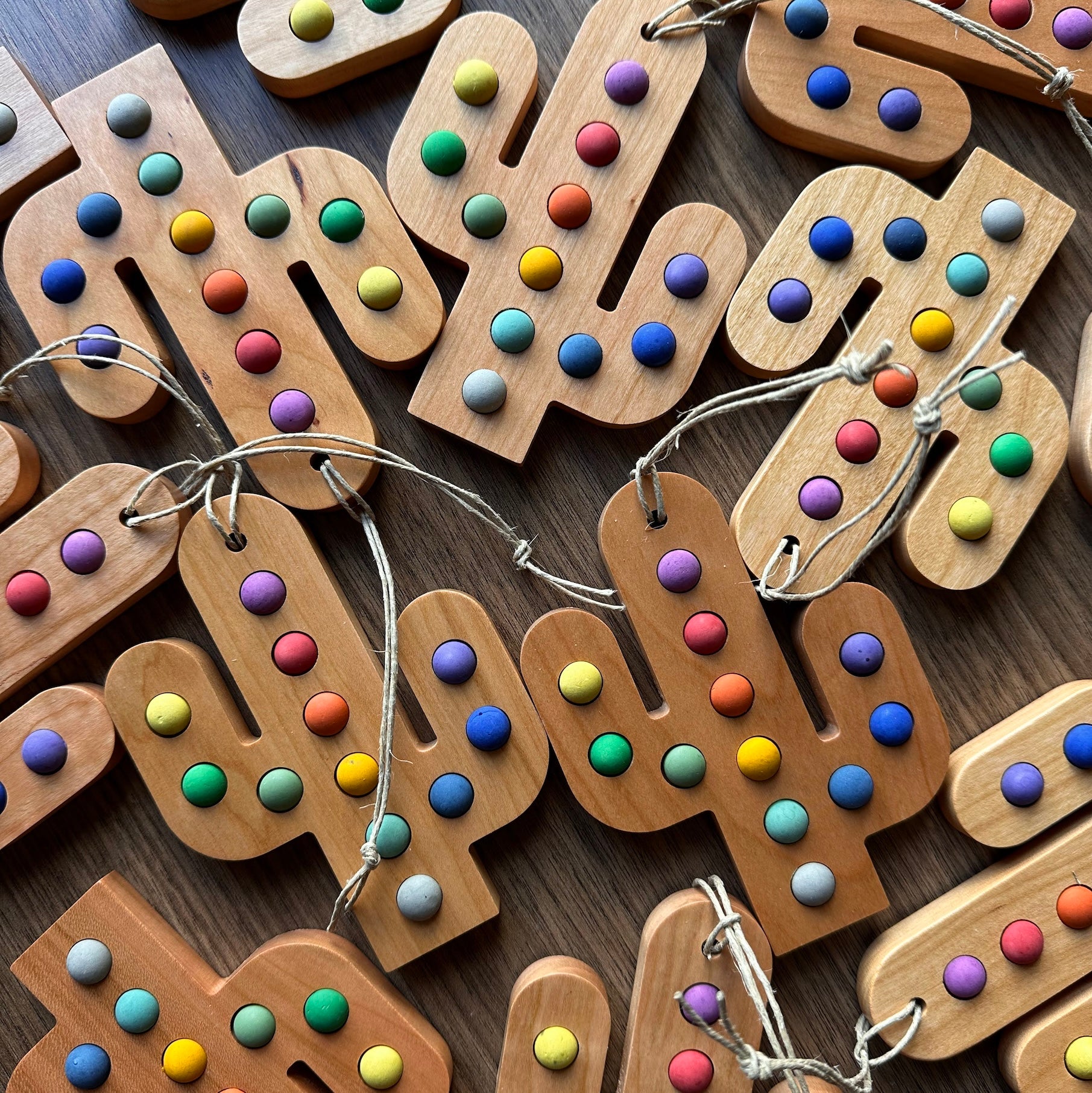 Soil-based mini ecopods set in cherry wooden ornament palettes.